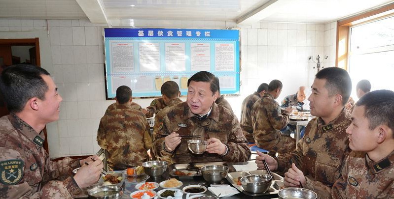 習近平主席來到內蒙古軍區邊防某團一連食堂,同官兵一邊共進午餐,一邊拉家常,了解士兵們衣、食、住、行等生活方面的問題。